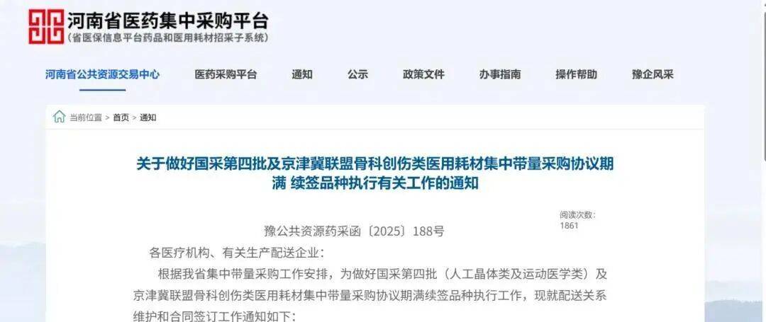 河南也在8月12日发布通知,要求做好国采第四批及京津冀联盟骨科创伤类耗材的协议期满续签工作,9月1日起执行。